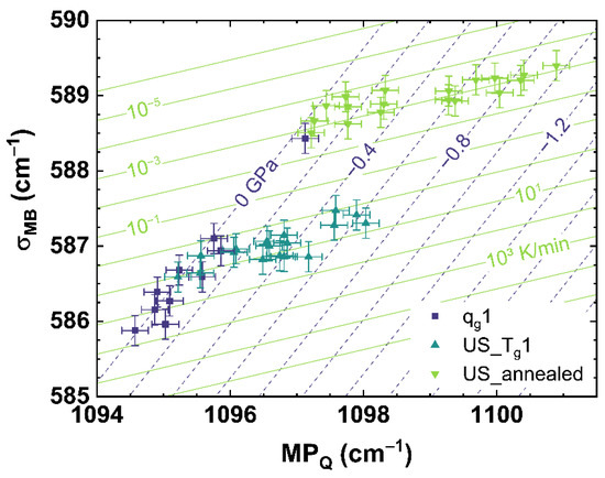 Figure 8 and Figure 9 show the comparison of observables deduced from different spectroscopic techniques, i.e., Raman spectroscopy versus photoluminescence and Brillouin spectroscopy versus photoluminescence, to separate the effects of cooling rate from those of applied uniaxial stress. However, we found it also possible to separate both effects by comparing suitable observables deduced from only one spectroscopic technique like Raman spectroscopy, which is shown in Figure 10 comparing σMB to MPQ.