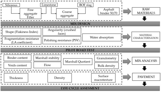 Therefore, the novelty of this study lies in two main facts. On one hand, it carries out full-scale research with untreated BOF slag and does not remain at the laboratory level. On the other hand, this paper examines the technical feasibility of used waste in road construction with real data, and analyses its environmental impacts via a Life Cycle Analysis (LCA). The quantities and materials used are based on a real test with proven technical performance to ensure the correct use of BOF slag on road construction.