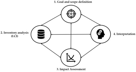 As can be seen in Figure 2, LCA methodology can be synthesised in four main phases. The first one is focused on defining the objectives, the functional unit and the scope (functional limits of the system). The life cycle inventory identifies and collects the data. Inputs and outputs associated with the processes within the system boundaries are identified and quantified. During the third phase, the evaluation of the significant potential environmental impacts is carried out using the data from the inventory phase. The last phase includes the interpretation of the results, as well as the eventual compiling of conclusions and recommendations for the improvement of the environmental performance of the system.