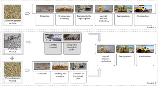Description of the system boundaries in both scenarios (AC-Base: mix with natural aggregates; AC-BOF: mix with BOF slag).
