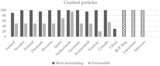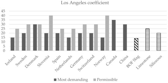 On the other hand, the requirements established in other countries for coarse aggregates in asphalt mixes have been analysed. The limiting parameters most commonly used are shown in Figure 4, Figure 5 and Figure 6 [40,60]. In this case, the road category has not been considered, and only the most restrictive (most demanding) and permissible values set in the different countries are shown.