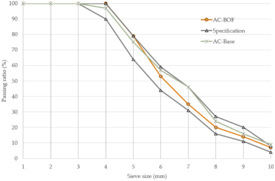 Particle size distribution gradations curves for conventional mix (AC-Base) and BOF slag mix (AC-BOF).