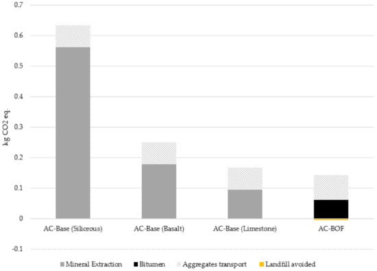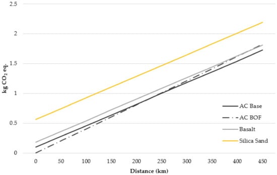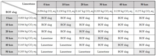 These findings notwithstanding, the distances from the aggregate quarry to the asphalt plant, as well as the distances involved in BOF slag production, differ depending on particular conditions. Therefore, a more interesting comparison would be to consider the carbon footprint of different transport distances for each aggregate. If the transport distance is not the same, the use of BOF slag may not be worthwhile from an environmental point of view.