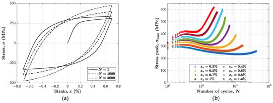 The cyclic stress–strain response observed in the experiment at = 0.7% is reported in Figure 1a. For more clarity, the figure only plots the 1st, 1000th and 2000th cycle.