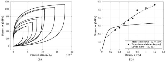 Masing behaviour analysis results: (a) stress–plastic strain hysteresis cycles rigidly translated to the origin (0,0); (b) comparison between the monotonic curve and the cyclic curve passing through the experimental points .