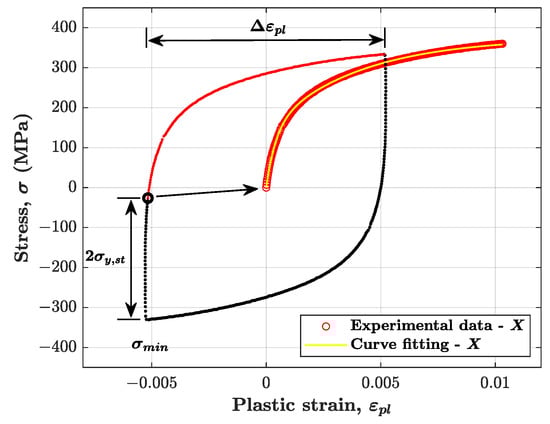 where , and are evaluated from the experimental cycle (see Figure 3); and are the set of values describing the branch of the cycle to be fitted, whereas and are the fitting parameters to be determined. The proposed fitting procedure is slightly approximated as it neglects the influence of isotropic hardening in one cycle.