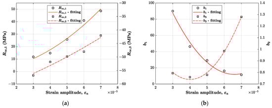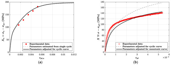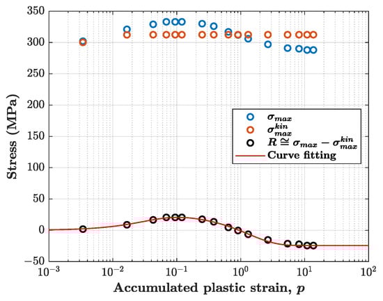 The kinematic model parameters are usually identified through curve fitting [21]. In particular, it is necessary to calculate the amplitude of the back stress and the amplitude of plastic strain in the stabilised cycles of each test at different strain amplitude . The experimental points obtained by the procedure described so far are then interpolated by the expression in Equation (4) in order to obtain and . The curve found in this way is called the ‘back stress cyclic curve’.