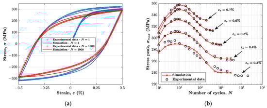 This section compares experiment with simulation. The simulation was carried out by the algorithm described in Appendix A, which allows one to simulate the uniaxial response. In this simulation, the parameters taken into account are reported in Table 2. Each strain amplitude is characterised by different isotropic hardening parameters. Furthermore, for every simulation the values of Young’s modulus and initial yield strength are respectively and .