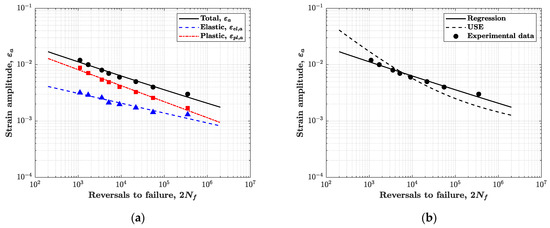 In a log-log diagram, Equation (12) is the sum of two straight lines. Therefore, the equation parameters can be estimated by a linear regression analysis of experimental data, which must be carried out separately for the elastic strain and the plastic strain parts. The linear regression model is , where and denote, respectively, the log-transformed fatigue life and strain amplitude, where obviously or depending on whether the elastic or plastic strain amplitude is considered. In the regression model, the quantity represents a normally distributed random variable with zero mean and constant standard deviation (where constant means “not a function of ”; this type of model is called homoscedastic). The random variable allows the regression model to account for the inherent (aleatory) variability of fatigue life .