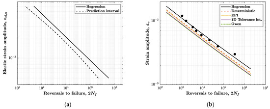 (a) Example of “hyperbolic” design curve obtained with the prediction interval method for the elastic strain amplitude; (b) comparison between Manson–Coffin and design curves from different methods.