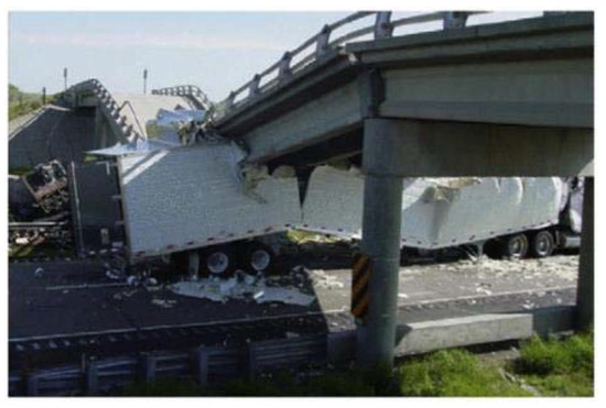 In the domestic aspect, Han Linhai [12] comprehensively expounded the stress characteristics of concrete-filled steel tube columns under different stress conditions; the Taiyuan University of Technology conducted multiple scaled concrete-filled steel column impact tests. Louw, JM [13] used 28 cantilever concrete columns and analyzed static, dynamic response characteristics when lateral load impact. SJP Richard and SHPerry [14] used a free-fall impact mounted in sleeve 70 of the concrete in the axial impact columns and described in its mechanical response. Amir Mirmiran et al. [15] used the finite element with concrete under direct impact of the finite element analysis. Through the gravity-type drop impact test on the typical structural column of the train passenger station, the dynamic response and damage characteristics of the structural column under impact can be accurately reflected, the quantitative data of the impact action can be obtained, and then the theoretical description model of the response of the element under impact can be established. This instructs the continuous resistant collapse of the overall structure. In this regard, the present study aims to improve the strengthened square columns’ impact capacity by increasing the number of layers of CFRP sheets bonded to specimens. This paper discusses the effects of the amount of CFRP sheets based on the experimental outcomes. Reinforced concrete structures often have to adjust and improve their performance during their service life. The main contributing factors are a change in use, new design standards, degradation due to corrosion in steel caused by exposure to an aggressive environment, and exposure to accidents. Additionally, impact force that is coming from the train in the metro station or shows a tractor-trailer colliding with a bridge superstructure as shown in Figure 1 [16] in Texas USA. In such circumstances, there are two possible solutions: replacement or retrofit.