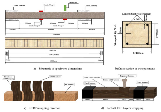 The application of fiber-reinforced polymer (FRP) materials in construction have increased in the past 20 years [1]. With the modernization process’s advancement and the increasing demand for railway transportation, the train’s operating density and speed have greatly increased. With the increasing number of high-speed rail stations built across China, structural safety issues have changed. This has been particularly highlighted, especially as research on the impact of train derailments on the structure’s overall safety has become increasingly important. Carbon fiber reinforced polymer (CFRP) is a type of FRPs, a polymer matrix composite material reinforced by carbon fibers. CFRP sheets’ significant advantages are pointed out as high strength, corrosion resistance, ease of implementation, and less impact on the original geometry. CFRP sheets are bonded to external faces of RC structures for multipurpose strengthening. This method can be carried out quickly, without using heavy equipment and other conventional methods (strand splices, external post-tensioning tendons, or steel plate jackets). At present, FRP composites are often used to reinforce existing concrete elements, for example, beams and columns for building structures. At present, many scholars have conducted a large number of studies on the impact resistance of structural elements. Numerous analysts researched the presentation of reinforced concrete beams and columns with FRP [2,3]. In this manner, for comparative execution levels, square or rectangular FRP confined concrete columns require more confinement than circular FRP bound concrete columns, along these lines, requiring more FRP sheet materials [4]. A cross-section could prompt a huge increment in development costs. In the previous decade, to take care of FRP confinement being less viable for columns, scholars led broad examinations on FRP confined concrete columns with square or rectangular sections. Jiang et al. [5] made a trial investigation of Fiber Reinforced Polymer (FRP)-restricted reinforced concrete (RC) columns, including distinctive bonding conditions between FRP and concrete. It was discovered that the bonding condition varieties do not significantly affect the FRP-confined RC columns’ worldwide response. Nevertheless, slipping at the bond interface harms the plastic hinge zone’s length. Related research [6] demonstrated that moisture entrance could seriously decay the long-term durability of FRP composite elements. Moreover, the temperature impact should not be neglected, particularly when the substrate is wood rather than concrete [6]. Square and rectangular columns have a wide scope of utilizations in structure development. All around, it is currently perceived that square and rectangular tubes FRP give less viable control than tube cylinders [7].
