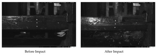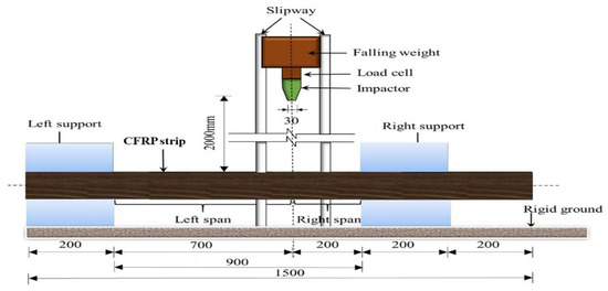 Drop hammer impact tests were conducted by dropping the weight from a prescribed height onto the point of 2L/9 of the element using the impact test apparatus, as shown in Figure 3. The CFRP elements are placed on the supports equipped with impact hammer load for measuring the reaction forces and are clamped at their ends using cross elements to prevent lifting off. The supports are fixed and unable to rotate freely while restraining in any direction of the elements. The weight was vertically dropped via the guide rails at 2L/9 from the elements’ right support. Here, the time history of the impact force P, strain ε, and deflection D was measured. After each test, the residual deflection was measured, and crack patterns observed on the specimens’ side surface were sketched for documentation. The impact force P and strain ε were recorded by the load cell set between the impactor and falling weight, as shown in Figure 3. The specimens’ dynamic deflection (D) was measured at 2L/9 from right support by utilizing an excel sheet for processing photos of a high-speed camera every 0.4 ms with Paint software. It was by calculating the pixel point with the white points’ coordinates that draw on the element and hammer.