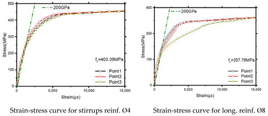 The steel bar type Φ4 (Chengdu, China) was used as transverse bars, and type Φ8 (Chengdu, China) was used as longitudinal bars (Figure 4b). Yields strength of the reinforcing bars was between 320 and 520 MPa. The strain–stress curves of steel bars are presented below in Figure 5. Maybe the paper will have an opinion in determining their yield strength that will be measured according to the “Metal Material Tensile Test Method” (GB/T228-2010) [22], as shown in Figure 5. The young’s modulus E of the reinforcement is measured through a static tensile experiment. Within the elastic limit of the reinforcement, according to Hooke’s law: