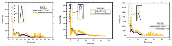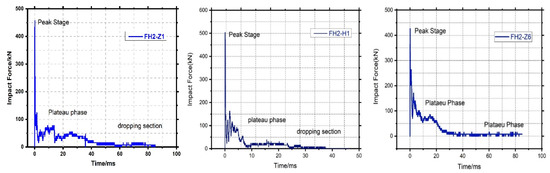 where is the hammer’s initial impact velocity. Among them, the peak point occurs when the drop hammer is in contact with the element. It can be found that the force and duration of FH2-Z1, FH2-H1, and FH2-Z6 at this stage are almost the same, and the maximum peaks are 458 kN, 504 kN, and 493 kN, respectively. In the peak section, the impact force reaches the maximum value and drops immediately. This is because the force is mainly determined by the contact stiffness and the element’s inertial force. Simultaneously, the CFRP is thin and has a small density.
