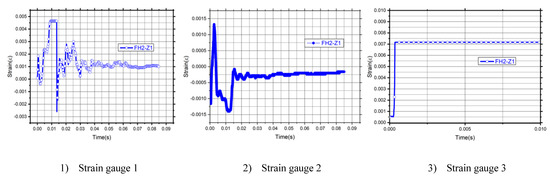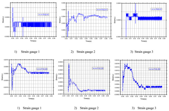 - Strain time–history curve: three strain gauges were pasted on the element’s surface to measure concrete compressive strain. The first one strain gauge is 350 mm away from the bottom left support, the second one 350 mm away from the top left support, and the third on the impact point of the element’s bottom.