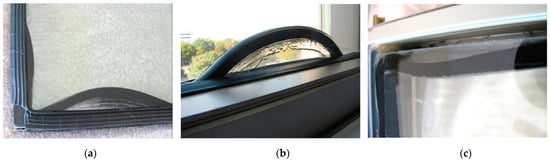 In [11] Watson et al. presented the results of both laboratory and field tests carried out to document the displacements of insulating glass seals. The research was conducted in the United States between 2008 and 2012. The authors focused on determining the frequency of displacement of thermoplastic sealing, including in particular dual-seals including PIB. The analysed displacements resulted in various defects, including twisting, bulging, cracking, out-of-straightness and out-of-squareness of the edge seal. In most cases, the sealing was shifted into the cavity. Alternating inward and outward movements of the seal, indicated by streaks and PIB residue on the glass surfaces, were infrequent. The number of streaks was found to correspond to the number of years in service, suggesting a seasonal nature of these movements. In any case, the result of such extreme seal movements significantly compromised the thermal performance of the glass edge and affected the appearance of glazing. Figure 1 shows examples of seal displacements found in the literature [11]. In addition, the authors of [11] studied cold flow displacement behaviour of various seal spacer assemblies in laboratory tests at various temperatures and under different loading conditions. A four-week long accelerated test showed that PIB-based primary seals are prone to displacement under loading. The reported cause was a poor bond between PIB and the secondary seal.