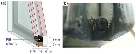 A typical dual seal IGU was used in the test, with the seal composed of PIB and silicone sealants. Glazing included a 6 mm thick ESG-type toughened glass outer pane and laminated inner pane. The latter was composed of two glass panes separated by a PVB interlayer, giving a total thickness of 8.76 mm. The width of the cavity, i.e., the distance between the opposite panes, was 16 mm and the cavity space was filled with argon. The 16 mm high seal spacer was composed of PIB -29 (Kömmerling) seal and DC3362 silicone. The PIB primary seal was more or less 8.0 mm wide over the whole perimeter, while the width of the secondary, silicone seal varied between 10.0 mm and 12.0 mm. Figure 4 shows the pictures of the IGU model and the actual IGU.