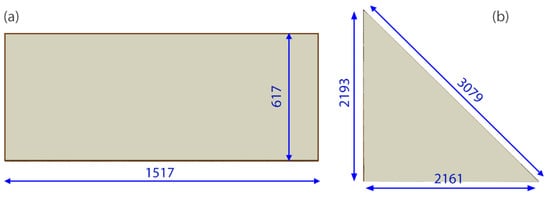 Specimens of two shapes were prepared for the tests: an approximately 0.6 m × 1.5 m rectangular unit and a triangular unit with 2.1 m long legs and 3.08 m long hypotenuse). These two shapes are shown in Figure 5.