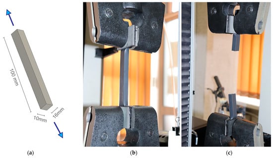 Testing of silicone: (a) dimensions of cut out specimens (b); tensile test at 23 °C; (c) finish after sample break.