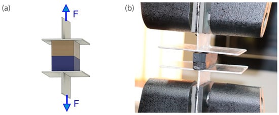 Detachment of PIB and silicone: (a) test set-up: (b) mounting of the specimen in the strength testing machine.