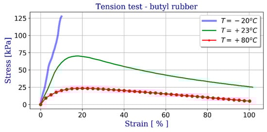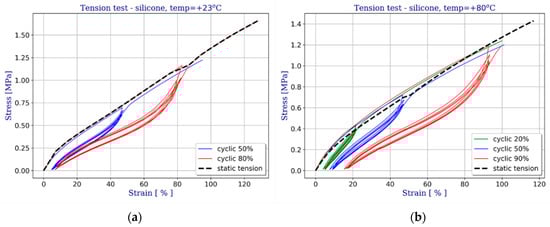 Figure 9 shows selected results for stretching of the silicone under analysis, represented by engineering stress-strain curves. The data were obtained at various temperatures by multiple loading and unloading cycles for each strain level. The percentages given in the legend indicate how much of the failure load was applied in a given cycle.