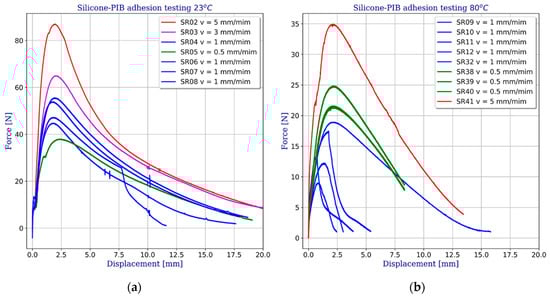 Very interesting results were obtained from the testing the adhesion between the silicone and PIB sealants. With very low stiffness polyisobutylene shows a very high sensitivity to both the temperature and the loading rate. As the temperature increases, the adhesion between silicone and PIB decreases, and the material becomes soft and undergoes plastic deformation. Additionally, a strong dependency between the strain and the load application rate was observed. This can be easily seen in Figure 10 showing displacement-force graphs at 23 °C (Figure 10a) and 80 °C (Figure 10b). Depending on the applied rate of displacement, the obtained forces vary by a few tens of percentages. The graphs show only the results obtained for uniform viscoplastic failure of butyl. Part of the forty one specimens had previously been damaged by partial or complete separation due to bond failure between silicone and butyl.