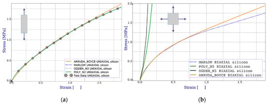 Comparison of the test data and various hyperelastic models. Stress–strain curves for tension test: (a) uniaxial; (b) biaxial.
