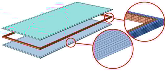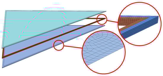 Finite element simulations were performed in ABAQUS/Standard (version 6.16, Dassault Systèmes, Villacoublay, France), a commercial software package which is appropriate for finding numerical solutions to non-linear problems. A few three-dimensional models of different shapes were used to simulate the IGU behaviour. Examples of rectangular (617 mm × 1517 mm) and triangular (2193 mm × 2148 mm) shapes are shown in Figure 14 and Figure 15. Each model consisted of three main parts: top pane, spacer frame (silicone + seal) and bottom pane. Simple-support boundary conditions were applied to the lateral surfaces at the glazing unit perimeter.