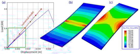 Rectangular model validation test: (a) equilibrium path (load-displacement); (b) contour plots showing the maximum principal stress in the top panes; (c) maximum principal stress in the bottom panes.