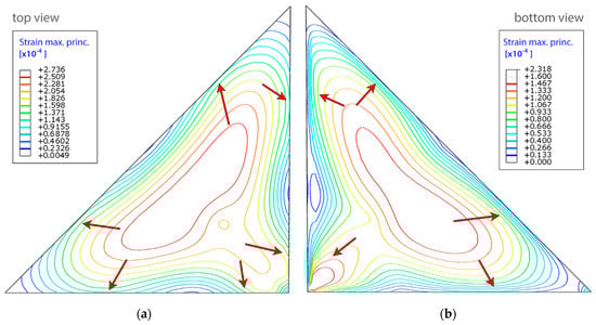 Further FE incremental results are reported to assess the influence of negative/positive pressure gradients on the deformation magnitude. In the case of negative gradient the glass pane and the seal are subjected to suction. The focus was placed on identifying points of the greatest deformations to determine where the strain of glass may affect the seal. Contour maps of maximum principal strains in the top and bottom glass panels are presented in Figure 18 below. Surprisingly enough, the points of the greatest strains (deformation of the glass pane adjacent to the seal) are not located in the middle of the span, but in the places pointed to by arrows.
