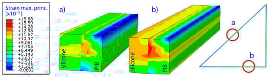 Cross-sectional view showing the distribution of the maximum principal strains in two selected pieces of the frame (silicone and butyl rubber PIB). Locations (a) and (b) presented on the right subfigure.