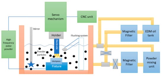 The fundamental science of PM-EDM method is still in the research phase, owing to the lack of in-depth clarification and the intricate nature of the associated variables. The selected electrically conductive or moderately conductive powders are amalgamated in the working liquid of the PM-EDM process. Figure 1 shows a model of the PM-EDM technique.