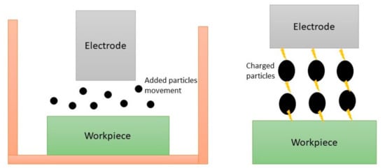 The added particles are energized by the attached ions on their surfaces during the discharge condition and pursue a zigzag movement due to the counter attractions of the opposite charges. Owing to the generated magnetic effect and the charged particles in the machining area, a capacitive effect is created, resulting in a chain-like connection among the charged particles. As a result, the insulating strength of the dielectric liquid is decreased. Furthermore, faster and uniform electric sparks are generated in the machining area resulting in an enhanced machining efficiency, such as the material erosion rate [10,19,21,28,37,57,59,60]. The mechanisms of alloy formation and debris deposition during the PM-EDM cycle are demonstrated in Figure 3.