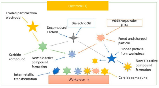 The schematic diagram describes the components and full set up of the PM-EDM technique. When electrical potential ranging from 75 V to 350 V is applied, an electrical magnetic field varying from 105 V/m to 107 V/m is created, retaining a tiny gap between the specimen and the electrode. A plasma path resulting from ionization of the dielectric is created. The plasma channel, electrically conductive in behavior, causes the ions to flow. Due to the collisions of ions in the plasma channel, discrete electrical sparks occur in the discharge channel, resulting in generation of high temperatures, ranging from 8000 °C to 12,000 °C. Because of the elevated temperature, the surrounding particles from the employed specimen, electrode, insulator liquid, and additive powders are fused and eroded. The phase transformation of the added HAp particles with increasing temperature produced during the EDM process are shown in Table 2.