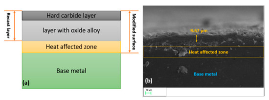 Structure of the modified surface layer: (a) illustration of layer, (b) obtained layer using the PM-EDM technique (reproduced with permission from ref. [74]).