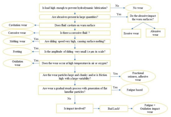 Wear is an important surface property which assists in determining the proper biomaterial selection and bio-implant design. To control and ensure long-term sustainability of the metallic biomaterials, the wear property is considered a major issue that causes materials’ removal from the eroded surfaces while undergoing relative sliding between two or more acting surfaces [79,115,116]. For the synovial joints including entire hip joints, knee, shoulder, and orthopedic implants, wear is considered as a critical issue, because of undergoing critical loads during regular movements, which depend on several parameters, such as material selection; coefficient of friction; contact stress; and surface characteristics, including roughness, hardness, and wettability (lubrication). Localized nano-regions of strong plastic deformation, nano-spall, and the attached spherical elements define the fretting wear that creates tiny and deep cracks on the acting surface, resulting in fatal metallic biomaterial failure [117,118,119]. The mechanisms of biomaterial wear propagation for different conditions are depicted in Figure 5.