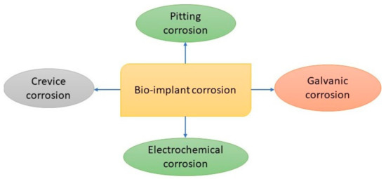 Corrosion is basically an electrochemical process that is characterized as an irreversible material degeneration because of the chemical reactions occurring between the material and its environment. The corrosion behavior of metallic biomaterials is widely measured for quality assurance and failure analysis, because the functionality, sustainability, and biocompatibility of biomaterials rely on their corrosion behavior. It has been suggested that “the more corrosion resistance, the more biocompatible” [38,79,117,156]. Implanted biomaterials have been recently claimed to start physical decay within 12–15 years, caused by electrochemical reactions, although most metallic biomaterials have a high corrosion resistance [38,156,157]. Therefore, corrosion is regarded as an important factor for the designing and selection of biomaterials for biomedical applications. The inserted implants confront challenges regarding their corrosion behavior, owing to electrochemical reactions due to the presence of aqueous liquids in the body. Chloride, pH-levels, and dissolved-oxygen are the most significant factors of body fluids that affect the corrosion behavior of metallic implants. In body fluids, key cations contain ions such as potassium, sodium, hydrogen, magnesium, and calcium. On the other hand, important anions include the ions made of hydroxide, chloride, sulfate, bio-carbonate, and phosphate. The most influential factors that affect the corrosion behavior of all metallic implants are the dissolved salts. The temperature and pH level of the body fluids also affect the electrochemical process. An increment of the body fluid temperature stimulates electrochemical reactions, resulting in a high corrosion rate. A decline in the pH level of the surrounding body fluid may cause the localized corrosion of biomedical devices [38,115,158,159]. Figure 6 shows the basic types of corrosion behavior induced in biomaterials.
