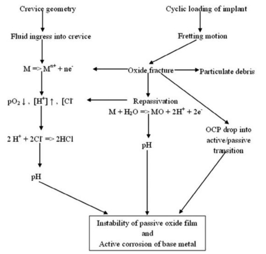 The different types of corrosion mechanisms that are pertinent to recent metallic biomaterials include pitting, galvanic, uniform, stress cracking, crevice, fatigue, intergranular, and fretting corrosion. Figure 7 demonstrates the mechanism of mechanically induced crevice corrosion in implants.