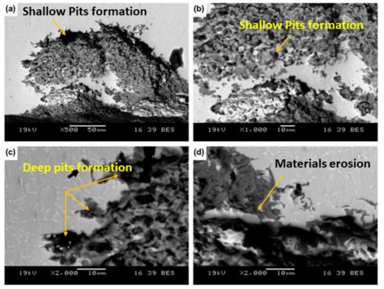 Figure 8a–d demonstrates the surface morphology when implanted biomaterials experience pitting corrosion. A destruction of the passive oxide film with shallow and deep pits is observed in Figure 8a–d. The quantity of the eroded elements caused by the corrosion can be calculated using Faraday’s Law [38]. Due to the occurrence of corrosion, debris such as Ni, Co, V, Al, Cr, and so on, eroded from the metallic implant’s surface, are released into the body causing alterations to cell performance, biological responses, a shortened lifecycle of the biomaterial, bone loss, implant loosening, toxicity, allergic effects, inflammation, and premature implant failure [15,64,159,162,163,164,165]. An excessive presence of Fe particles in the blood causes liver failure, long-term organ damage, and damage to lipids, DNA, and proteins [166,167]. High quantities of Cr and Co in the human body result in hemolysis and muscle fatigue [165]. In summary, the corrosion phenomena from metallic implants may have three effects on body tissues: (1) electrical currents can influence cell behavior, (2) altering the chemical environment, and (3) the metal ions can influence the metabolism of cells [38,168]. Table 4 summarizes the influence of released debris from biomaterial surfaces on biological responses after corrosion and wear occur inside a living body.