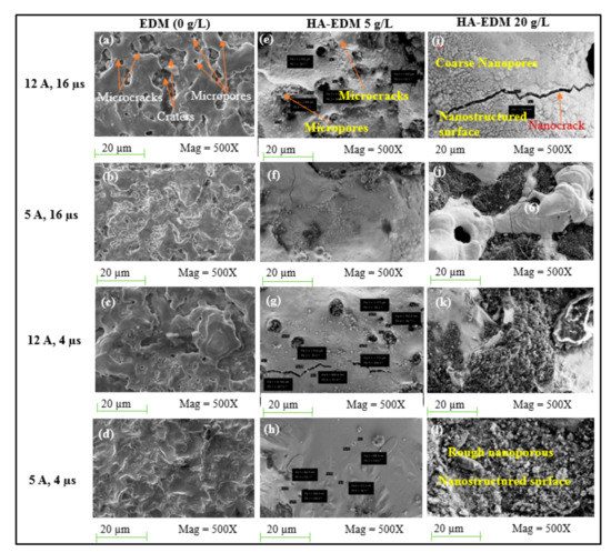 Influence of current and HA powder concentration on the modified surface morphology (a–l) showing microcracks, micropores, shallow craters, and nanostructure formation (reproduced with permission from ref. [54]).