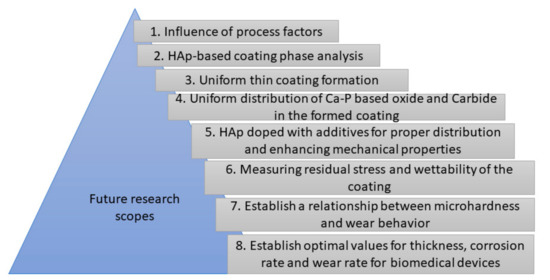 The wear behavior of biomaterials is regarded as an important mechanical property, which may cause mechanical failure of inserted implants. This property may depend on the design, manufacturing process, coating surface quality, coating alloying, and so on. During the PM-EDM process, a very high temperature, ranging from 8000 °C to 12,000 °C, is created, which may cause the creation of residual stresses in the coating. These stresses may make the implant surface prone to wear. Estimating the residual stresses from the developed layer is another challenge. The surface roughness and the wettability of modified layer are important factors for the introduction of wear. The challenge lies in obtaining the proper roughness and wettability of the modified surface to improve the wear resistance. Presently, there is no established mathematical relation between the microhardness and the wear behavior. Therefore, a clear relationship between them should be established to resolve this issue. Figure 10 summarizes future research areas regarding HAp-based coating using the PM-EDM process.