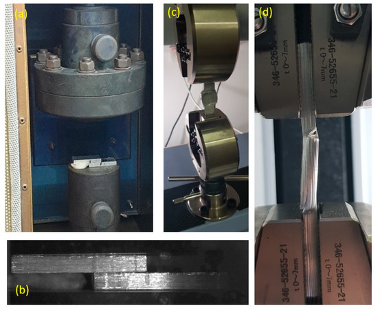 A specimen in the compression experimental system (a), and initial beam configuration in the compression tests, placed within the system (b). A specimen in the tensile machine (c), also shown from a side view inside the tensile grips (d).
