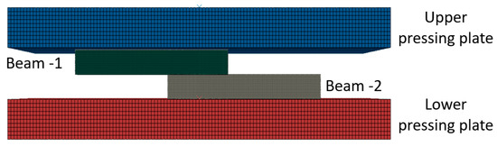 In the present study, beams of Al6061 were cut from a flat plate (cold rolled with surface quality N6) to approximate dimensions of 6.5 × 10 × 58 mm each. Hot compression tests were conducted in an MTS exceed system machine with maximal load of 300 KN, equipped with an environmental chamber of up to 550 °C. In order to create diffusion bonding using plastic forming, pairs of Al6061 beams were placed one on top of the other with overlap of 20 mm and compressed to different degrees of axial deformations under 300, 400 or 500 °C using a constant ram velocity of 1 mm/min (see Figure 1a). The non-overlapping part of the beams was intentionally left in order to enable consecutive tension tests for examining the debonding between the beams. The initial configuration of the beams in the compression tests is presented in Figure 1b. Special attention was given to collinear placement of the beams, one relative to the other. The specimen deformation during the bonding and debonding process was monitored using a high-resolution Manta G-319 camera. The time-dependent deformation patterns were subsequently used to validate the computational models as will be discussed later on.