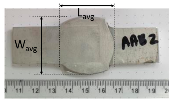 It can be seen from Table 2 that, at the smallest reductions, bonding was not achieved at 500 °C; however, it was achieved at 400 °C and 300 °C. The dimensions of the overlap area are indicated in Figure 3, using an example of specimen AAA2 after the compression.