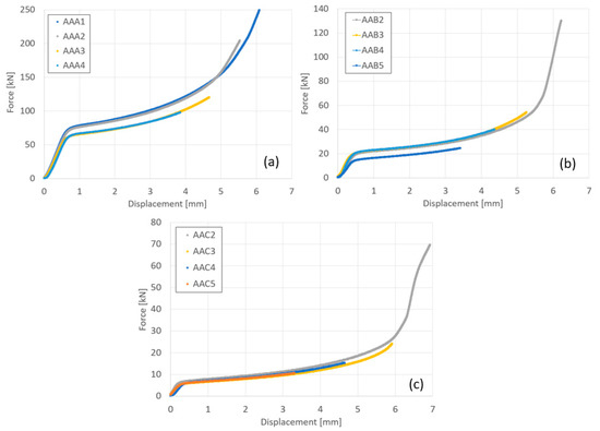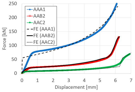 It should be noted that the differences in the force–displacement curves of the specimens AAA3,AAA4 compared to AAA1,AAA2 result from differences in the length of the overlap (see Figure 1) when positioning of the specimens in the furnace for the compression test (which was significantly smaller for specimens AAA3,AAA4).