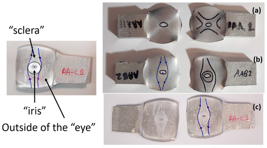 Following the debonding of the beams by the tension test, the revealed interface has several distinguishable areas, which can be observed without any equipment. As can be seen from Figure 7, the same general pattern can be observed in the specimens that were bonded at different degrees of reduction (see Figure 7a–c), as well as at different temperatures. This macroscopic pattern resembled an eye, and included a rhombus-like area (“sclera”, outlined on the specimen surface in blue in Figure 7), which contains a round inner “iris” area (see Figure 7b). The macroscopic pattern is a bit different at 300 °C, where the region of the “sclera” resembles the letter “X” rather than a rhombus. In the specimens that were bonded at the same temperature, the macroscopic patterns are similar (however their dimensions change with different reductions).
