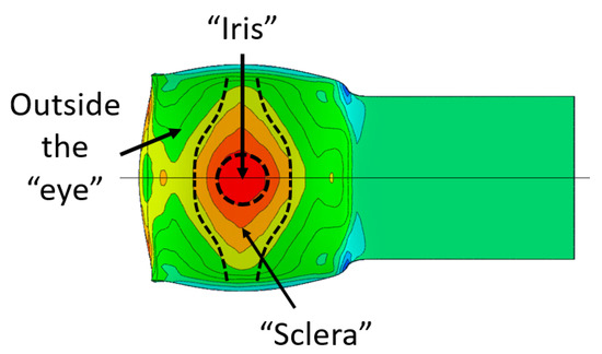 In the previous section, the debonded interface was divided into three macroscopically distinguishable areas—the “iris”, “sclera”, and the outside of the “eye”. In order to obtain a better understanding of the thermo-mechanical fields that influenced these macroscopic features and created the different surface textures, FE models of the specimens, compressed at 300 °C, 400 °C and 500 °C to different degrees of reduction, were created. Mechanical fields, such as the principal components of the strains and stresses, were examined along the interface. Out of those, the ones that create contours that resemble the contours of the “eye” are presented in Table 5, for several specimens. It is important to mention that the FE thermo-mechanical models were only of the compression stage (i.e., the stage of bonding creation), and the mechanical fields presented in Table 5 show the fields iso-contours when reaching the final reduction in the specific specimen.