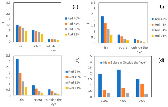 It can clearly be seen in Figure 9a–c that the computed average values of J are considerably higher in the “iris” region, for all temperatures considered. The J value decreases in the “sclera” and in the area outside of the “eye”. It can also be seen that the trend in J values between the different regions is maintained for all temperatures; however, the differences between the regions are greater as the temperature increases. It can be seen in Figure 9d that the average value of J in the “iris” is greater at 400 °C compared to the value at 500 °C. This correlates to the findings shown in Table 4, which show the highest density of dimples in the “iris” at 400 °C, compared to 500 °C and 300 °C. Figure 9d also shows that similar values of J outside the “eye” are obtained for 400 °C and 500 °C, with smaller values for 300 °C. These findings also correlate well with the metallurgical observation, which shows the presence of shallow dimples at 400 °C and 500 °C, and almost no evidence of metallurgical bonding at 300 °C. Nevertheless, the high value of J in the “sclera” at 300 °C, compared to 400 °C and 500 °C, does not seem to correlate with the metallurgical observations, since at 300 °C only a fraction of the area shows evidence of metallurgical bonding. Although the experimental/computational methodology presented in this study seems promising for identifying the relation between the interface conditions and the resulting bonding quality, more experimental data is required in order to determine the critical value of J for full metallurgical bonding in Al6061.