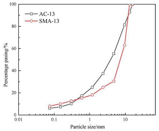 AC-13 and SMA-13 asphalt mixtures were used to simulate the actual asphalt pavement surface, on which the fabricated fog-sealing adhesive material was sprayed. Figure 1 presents the gradation of the mixtures. The asphalt/aggregate ratios of AC-13 and SMA-13 were 4.8% and 5.0%, respectively.